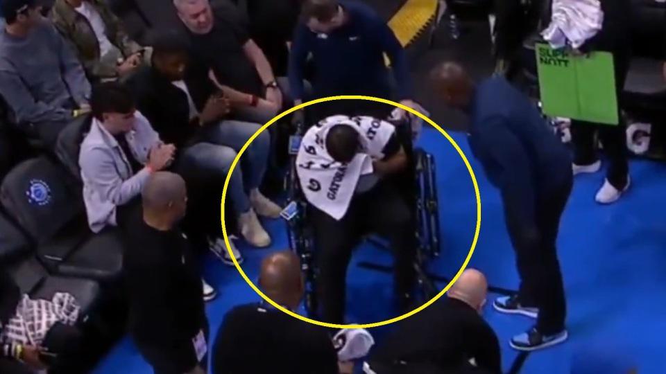 暂停期间,他跪倒在地,随后76人队的工作人员、训练师以及同为裁判的詹姆斯-威廉姆斯立刻围了上来。肯尼迪最终被轮椅推离赛场,头上盖着一条毛巾,神情看上去痛苦难忍。